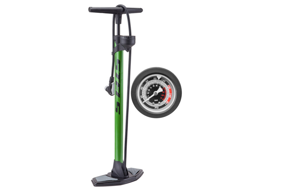 > Насос P32B-06 ручной велосипедный стационарный с манометром, стальной корпус, диаметр 32мм, длина 595 мм, шланг с автовентилем/Presta, зеленый (арт. 320054)