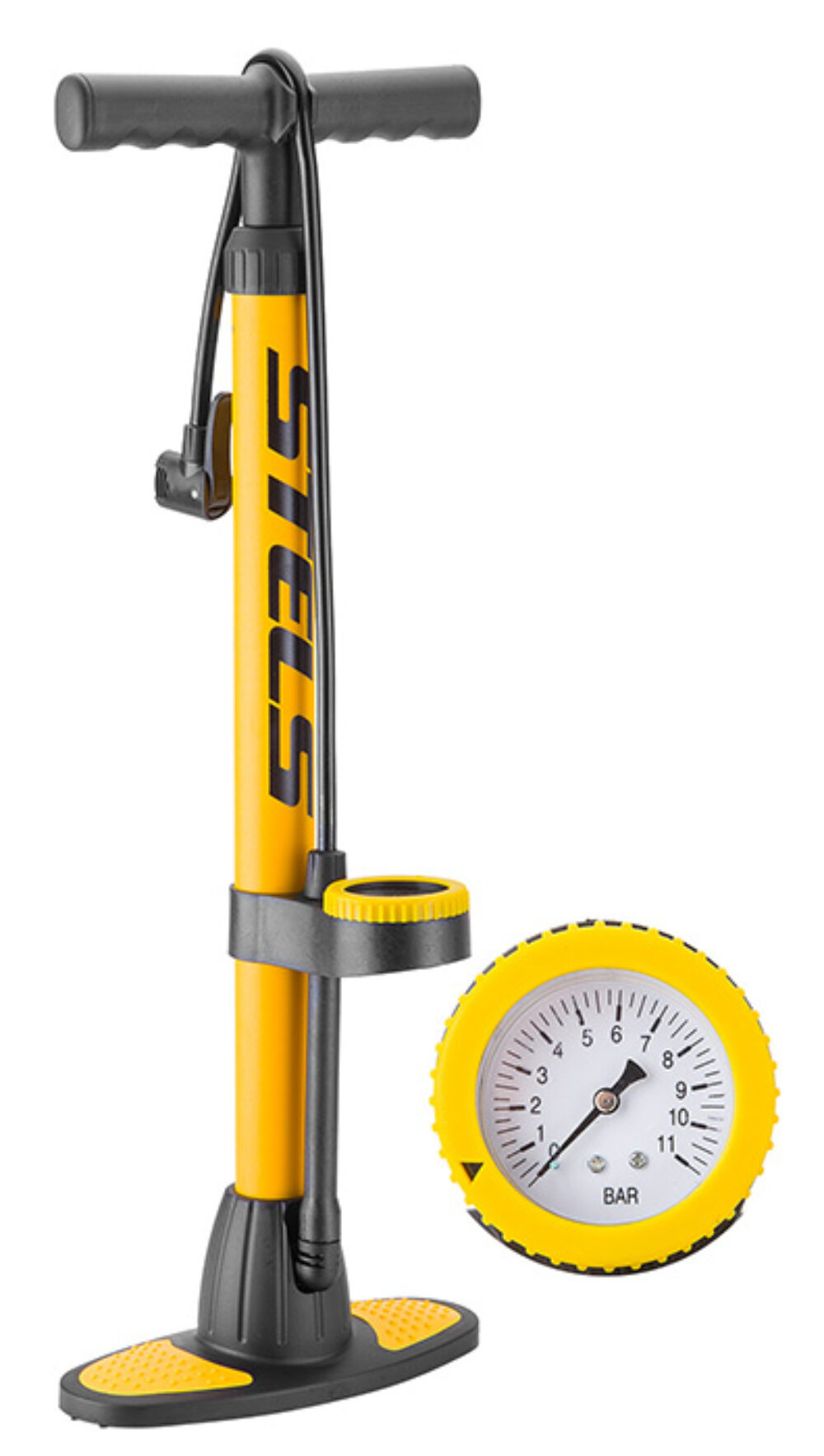 > Насос велосипедный напольный ручной THP-2001A STELS с манометром, пластиковый корпус, диаметром 38 мм и длиной 480 мм, шланг с автовентилем/Presta/Dunlop, жёлтый (арт. 320099)