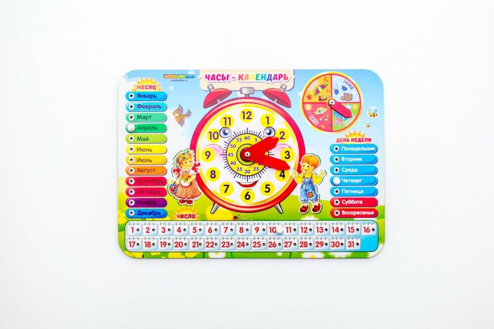 Дерево Часы календарь-1 многофункциональная развивающая игрушка для знакомства малыша с временем. Игрушка представляет собой красочный деревянный планшет с подвижными стрелками и съёмными пластиковыми деталями-указателями. Изображение разделено на не (арт