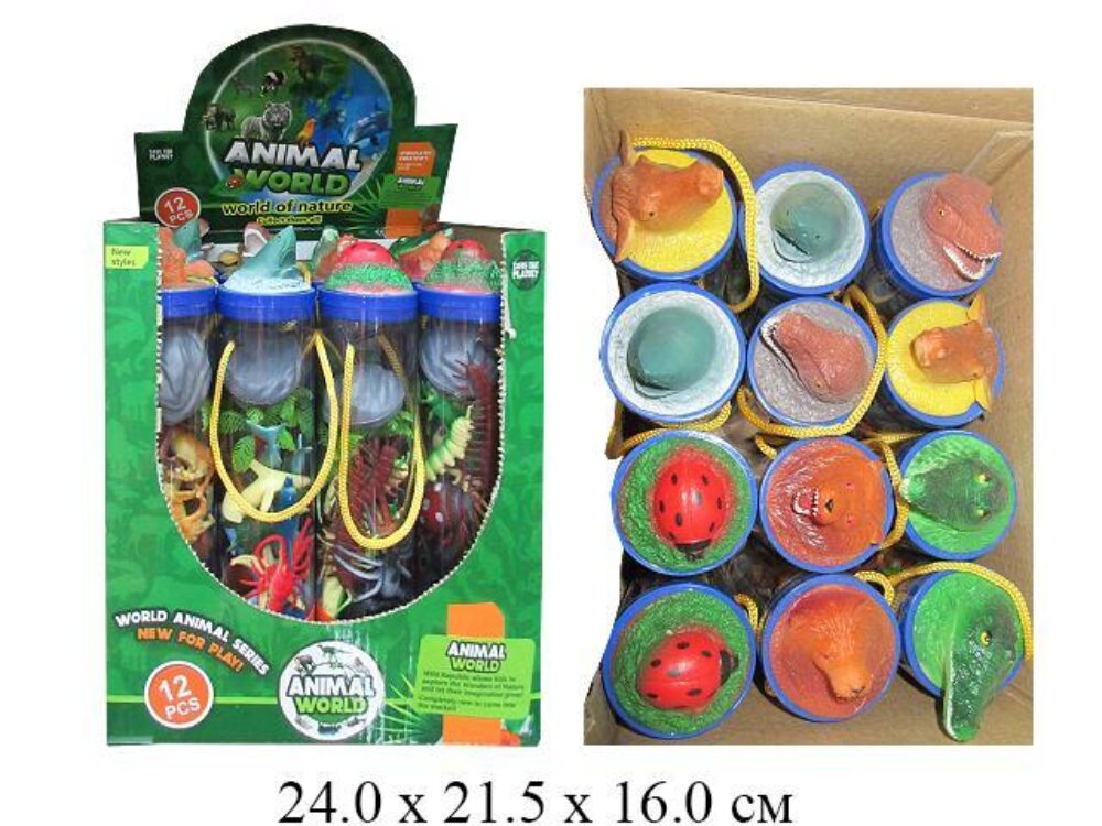 Набор животных в тубусе 6видов в дисплее с ГОЛОВОЙ ЖИВОТНОГО