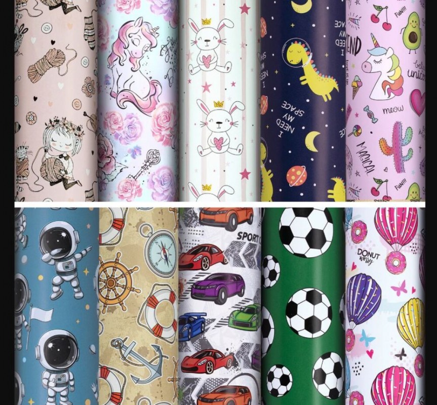 Бумага упаковочная подарочная мелованная "For Kids", 70x100 см, 10 дизайнов ассорти, ЗОЛОТАЯ СКАЗКА,