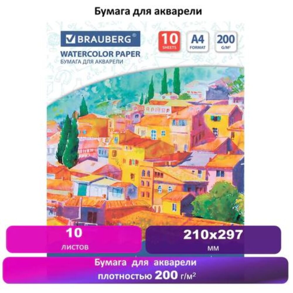 Бумага для акварели А4, 10 л., 200 г/м2, 210х297 мм, BRAUBERG, "Южный городок", 111070 (арт. С111070)