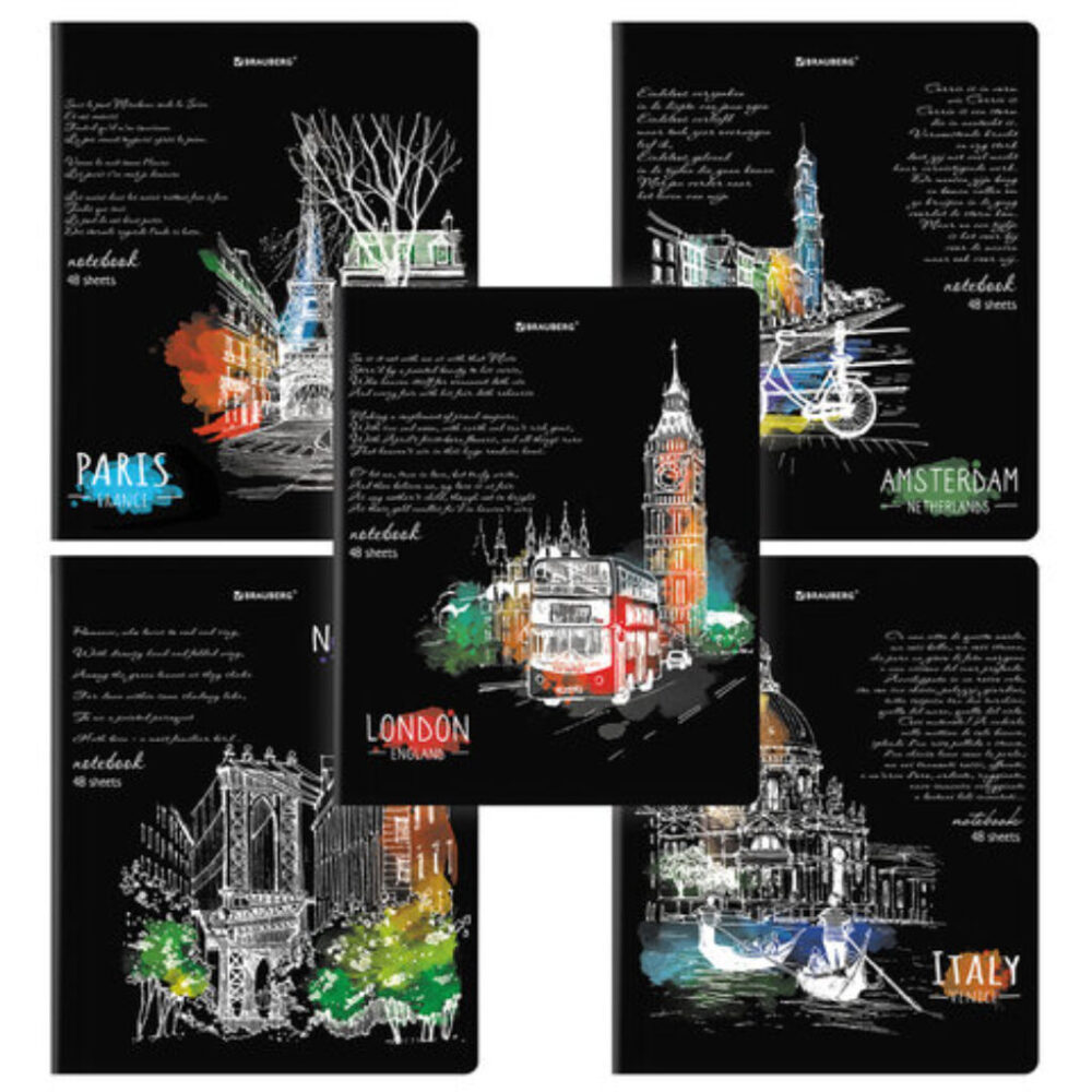 Тетрадь А5, 48 л., BRAUBERG, скоба, клетка, глянцевый лак, "Города" (микс в спайке), 404346 (арт. С404346)