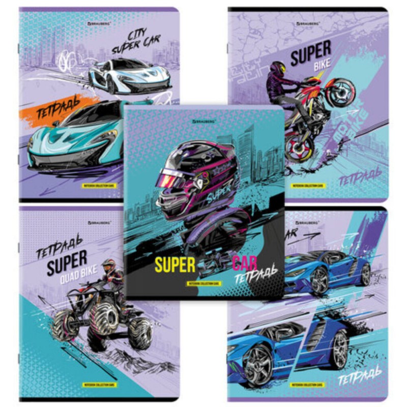 Тетрадь А5, 48 л., BRAUBERG, скоба, клетка, глянцевый лак, "Race" (микс в спайке), 404349 (арт. С404349)