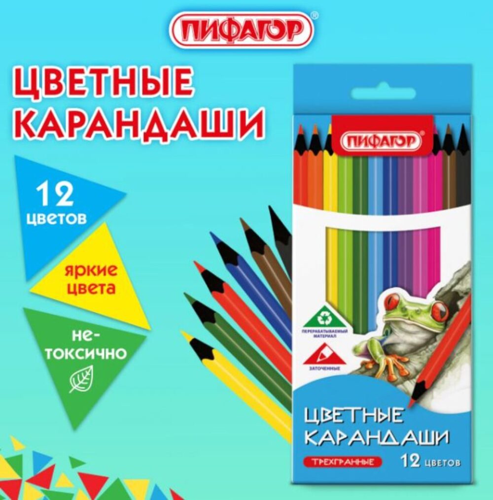 Карандаши цветные 12 цветов ПИФАГОР СТАНДАРТ, трехгранный корпус, 182087