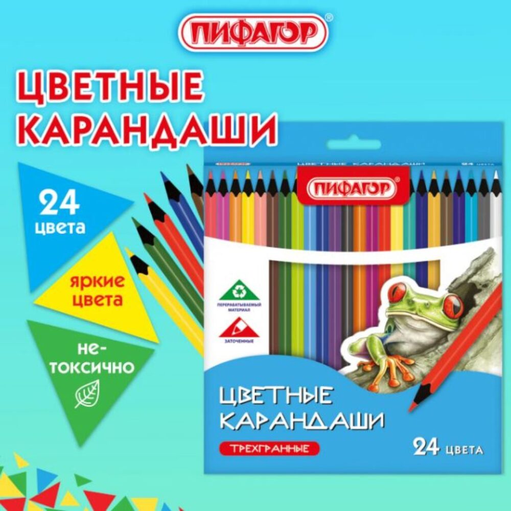Карандаши цветные 24 цвета, ПИФАГОР СТАНДАРТ трехгранный корпус, 182088
