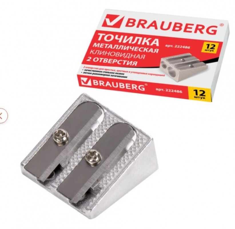 Точилка 2 отверстия BRAUBERG "Style", металлическая клиновидная, для чернографитных карандашей 12шт (арт. С222486)