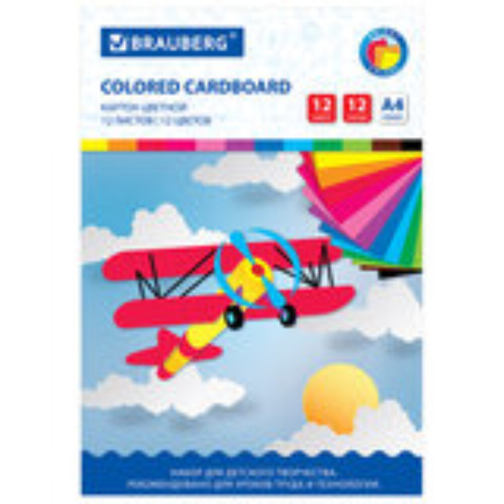 Картон цветной А4 12 л, 12 цв, немелованный, в папке, BRAUBERG, 200х290мм, Самолет (арт. С113556)