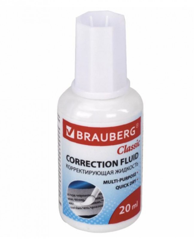 Корректирующая жидкость BRAUBERG "Classic",быстросохнущая, 20 мл, с кисточкой, 220255 (арт. с220255)