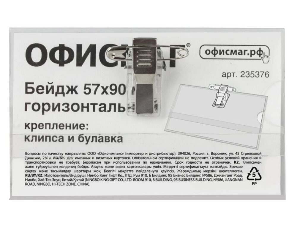Бейдж горизонтальный (57х90 мм), с клипсой и булавкой, жесткий, ОФИСМАГ, 235376 (арт. С253576)