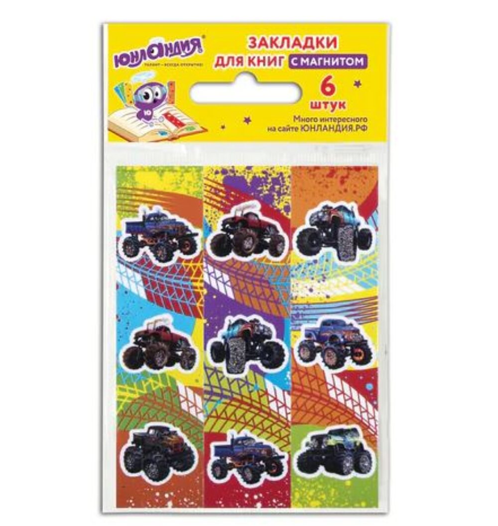 Закладки для книг с магнитом "МОНСТР-ТРАК", набор 6 шт., блестки, 25x196 мм, ЮНЛАНДИЯ, 111636 (арт. С111636)